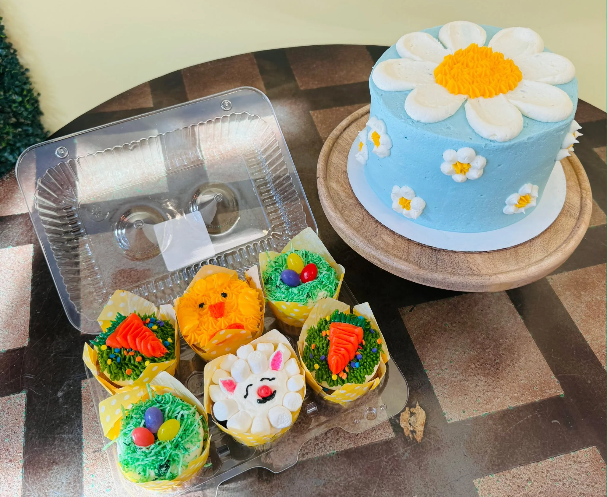 6 pack of Easter Cupcakes: Two Carrot, Two Coconut Easter Baskets, One Lemon Chick, and One Chocolate Lamb - $25